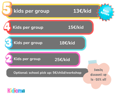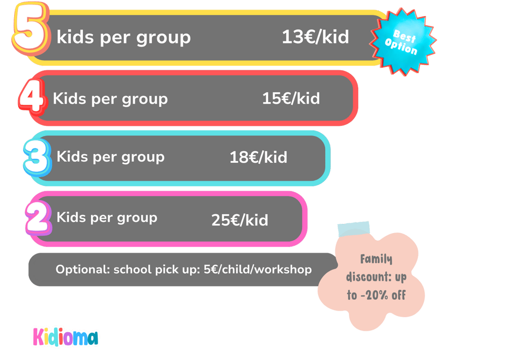 Workshops can be organized anywhere in the Madrid community. Parents choose language (French or English)