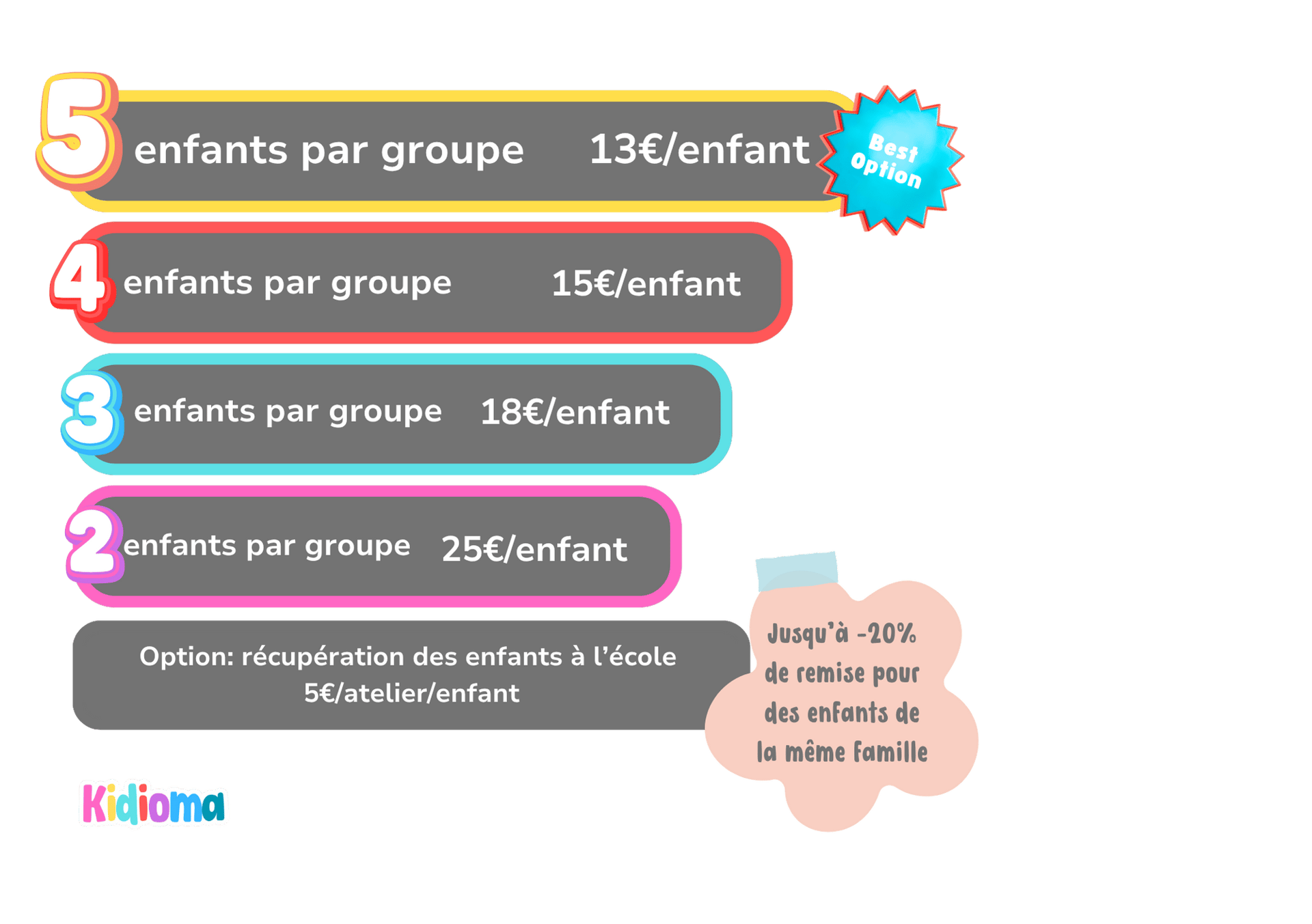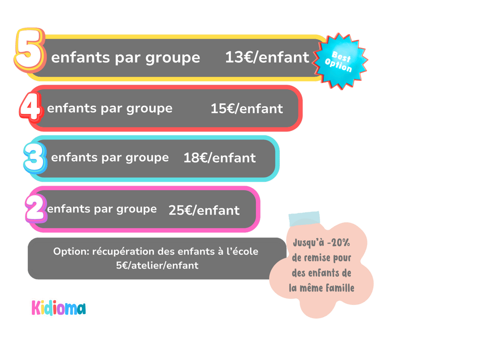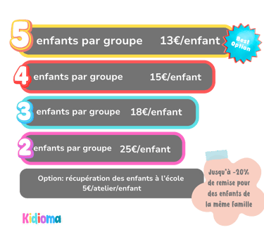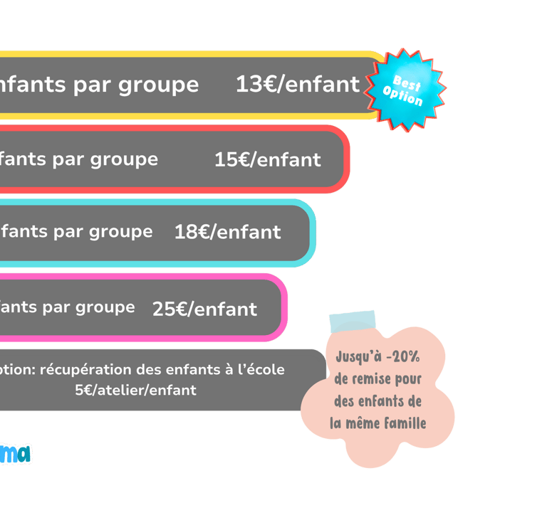 Les ateliers peuvent être animés à partir du moment où 2 enfants minimum sont inscrits. Les prix sont dégressifs (avec 5 enfants, le tarif par enfant est le plus bas). L'abonnement fonctionne sur un an (tarif le plus avantageux) mais peuvent aussi être souscrits pour une durée d'un trimestre, moyennant un coût plus important.